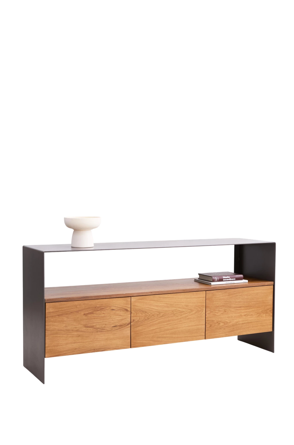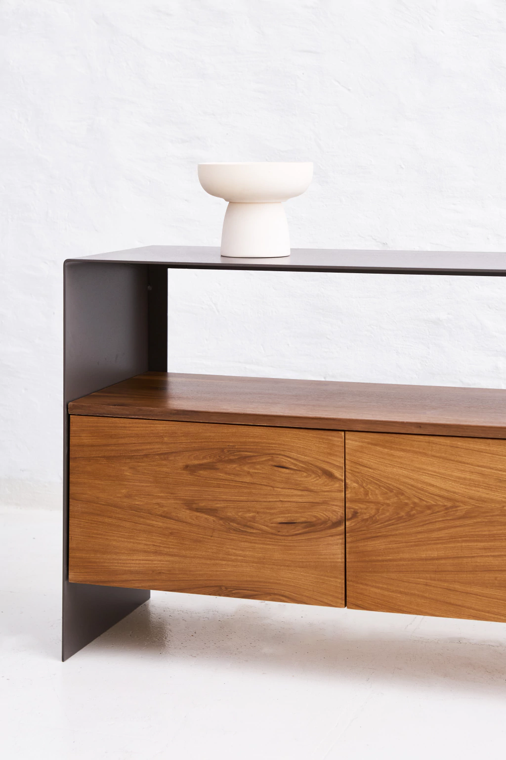 Cómoda baja hecha en chapa plegada, 3 cajónes de madera con sistema push o telescópico.