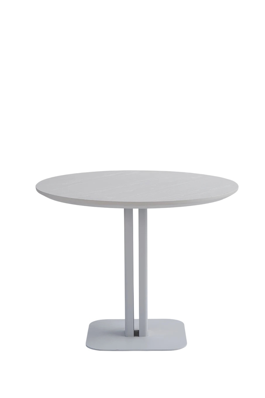 Mesa de comedor C-C La Carpintería con base de chapa plegada y hierro con tapa enchapado natural laqueado poliuretanico blanco con veta abierta.