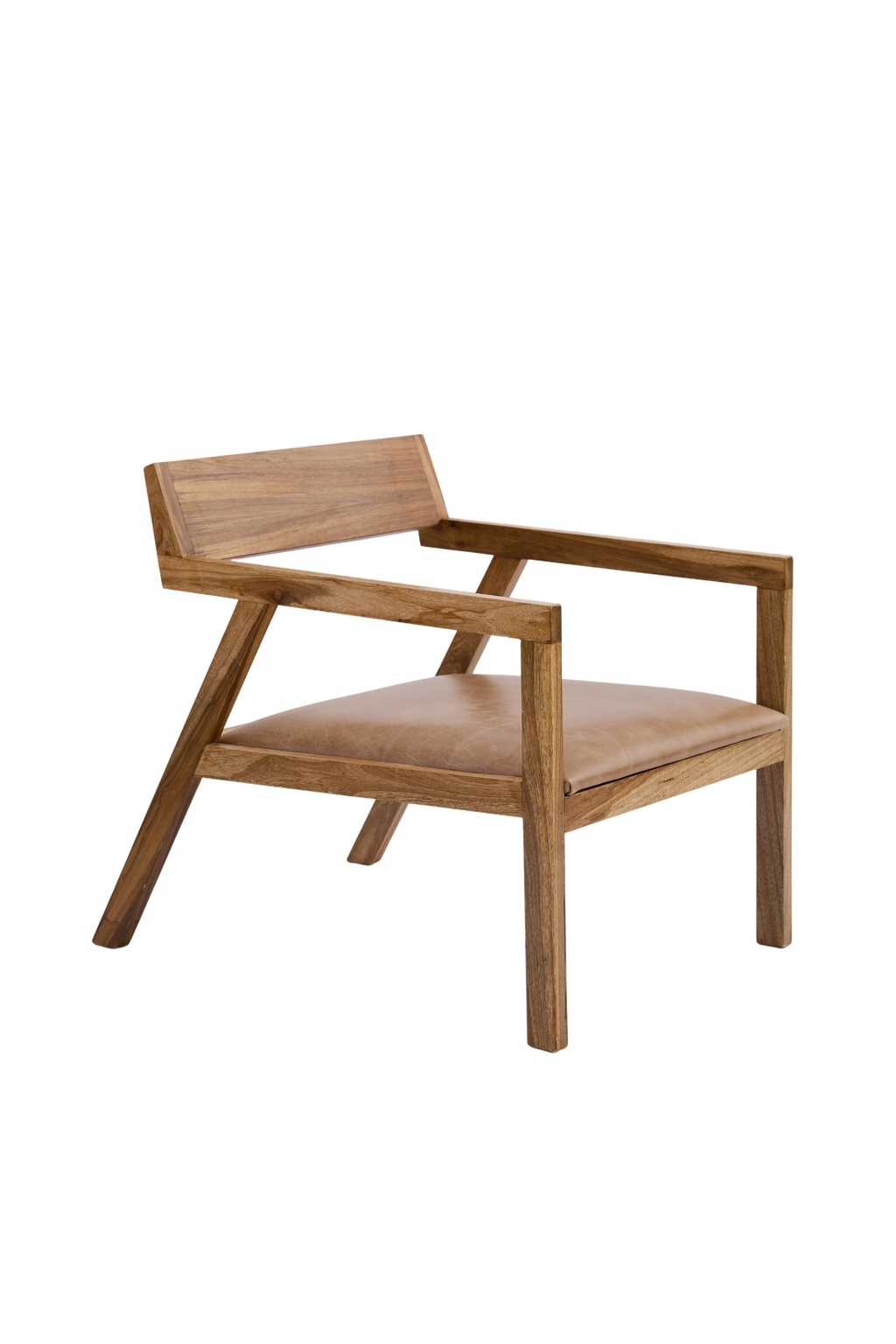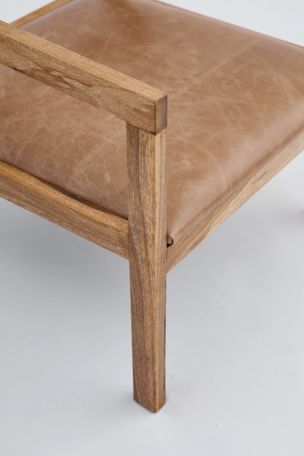 Poltrona con apoyabrazos hecha en madera peteribi, tapizada en cuero.